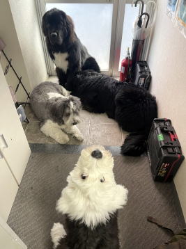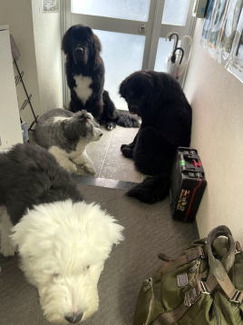 退勤時間になると玄関に全員集合します・・・(;・∀・) みんな先に外に出たくて入り口前を取り合いますが、ボンとデンが陣取っています・・・(*´з`)